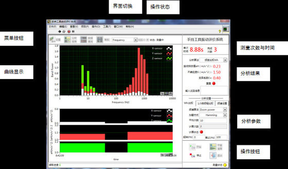 La interfaz de prueba y análisis muestra la amplitud y frecuencia de diferentes bandas de frecuencia central con 1 ≤ 3 octavas, los datos analizados por el método Wh y el método 1 ≤ 3 octavas, y muestra que el valor de emisión de vibración aH, la incertidumbre K y el coeficiente de variación Cv , están en buen acuerdo con los requisitos estándar a través de la medida del mango de la herramienta.